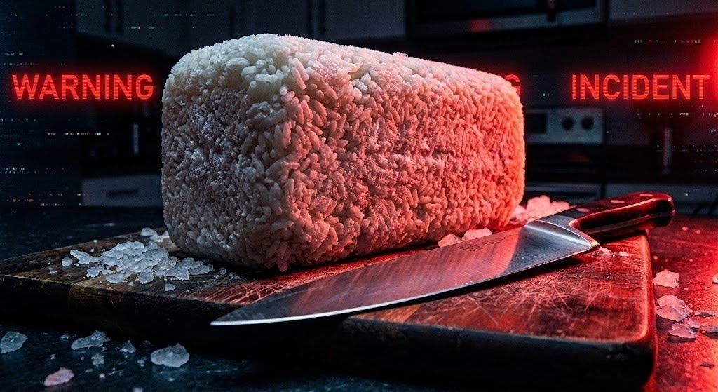 原因は、「あと数分待つのが惜しい」という些細な効率化への欲求です。私は半解凍の米塊に対し、包丁をあて、左手で背を押さえ、体重を乗せて押し込みました。